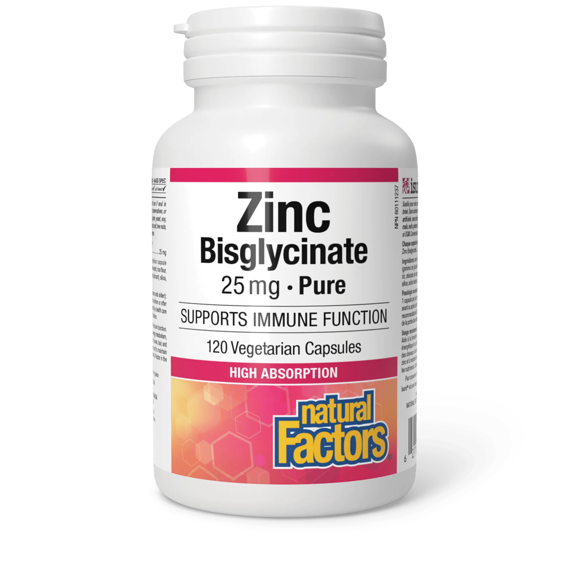 Natural Factors Zinc Bisglycinate is an easy-to-absorb zinc supplement that is gentle on the stomach, supporting the maintenance of good health. Zinc is well known for supporting and protecting the immune system, but it is also an essential trace mineral needed for numerous other functions throughout the body.